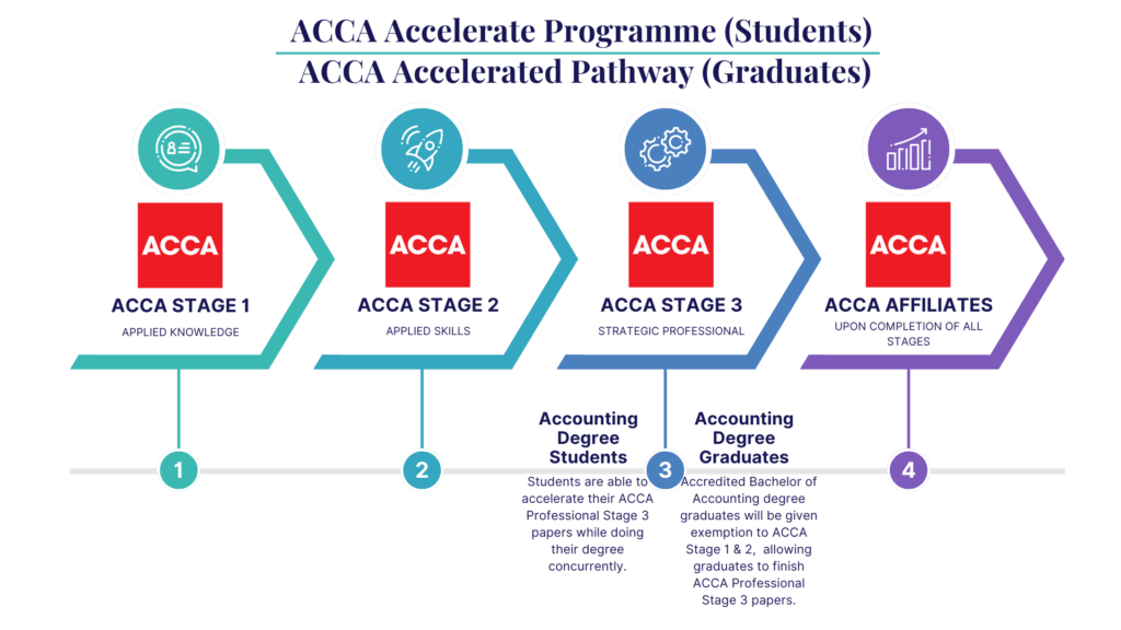 Also for Bachelor of Accounting graduates who aspired to take up the challenge. Accredited Bachelor of Accounting degree graduates are eligible to follow the ACCA Accelerated Pathway and begin their ACCA Stage 3 Strategic Professional level.